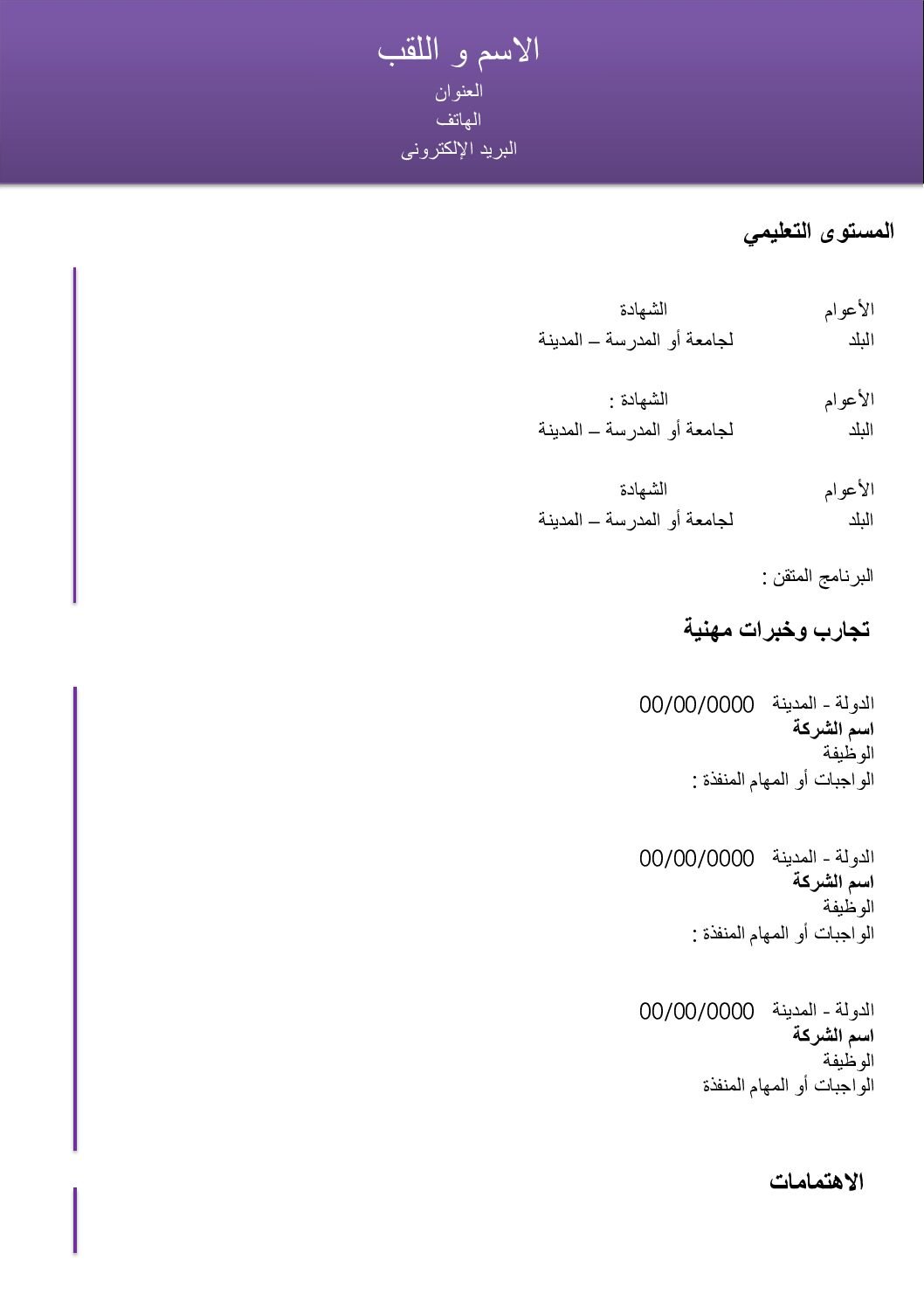 سيرة ذاتية بالعربي وصممت ان تكون بسيطة وسهلة في التعديل أو الاضافة أو تطوير والتحسين عليها ، وهي تناسب كل من يبحث عن عمل من: