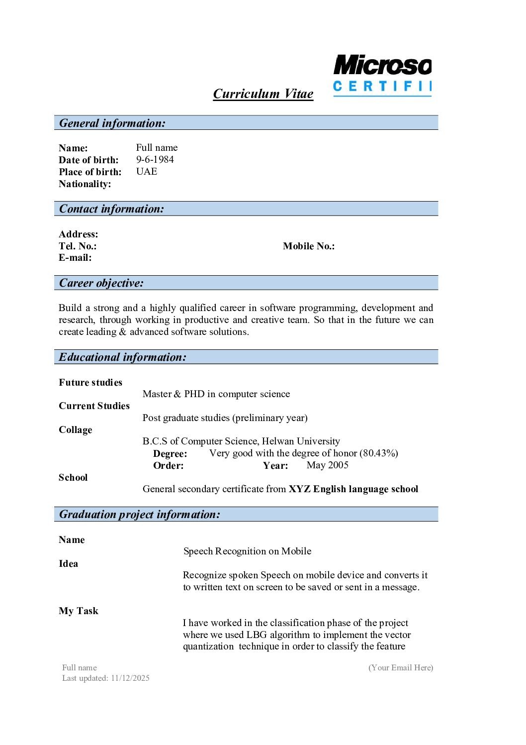 سيرة ذاتية لمتقدم في تخصص علوم الحاسب باللغة الانكليزية